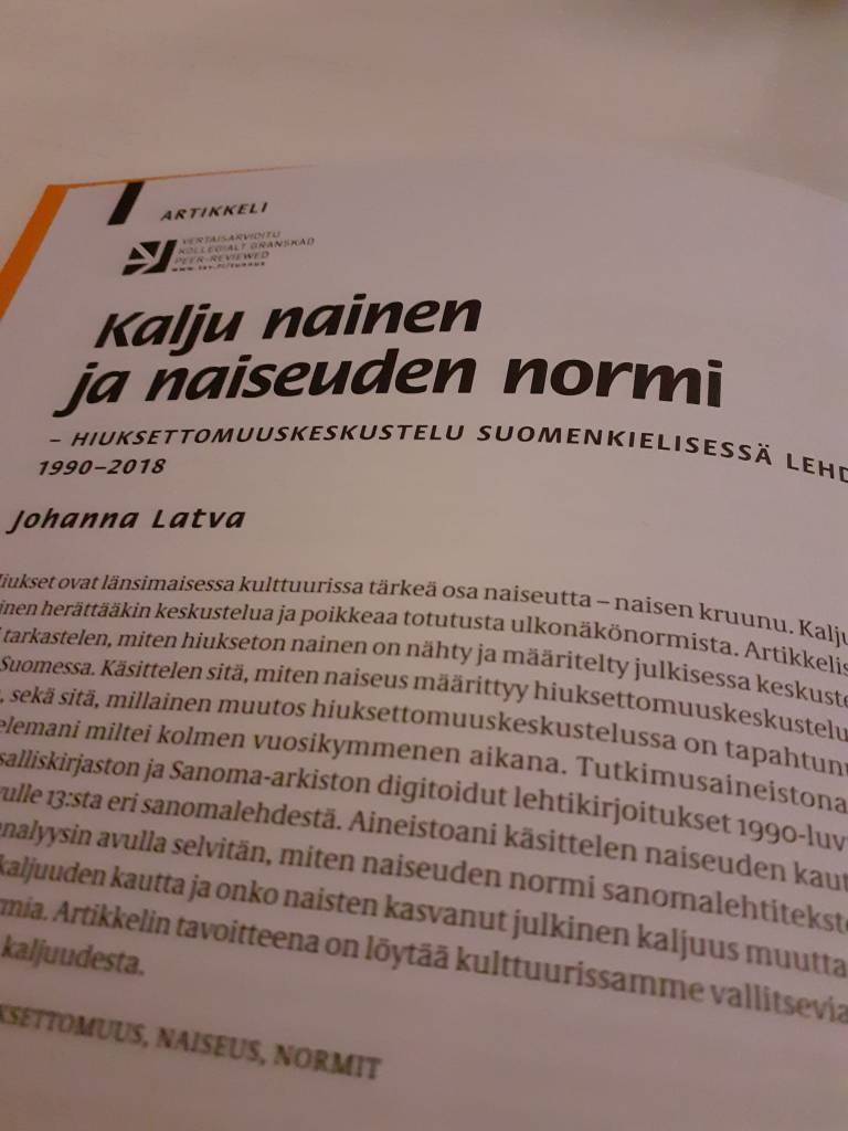 Väitöskirjani ensimmäinen vertaisarvioitu artikkeli julkaistiin Sukupuolentutkimuksen seuran Sukupuolentutkimus -Genusforskning -lehden numerossa 4/2021. Artikkelini on Kalju nainen ja naiseuden normi— hiuksettomuuskeskustelu suomenkielisessä lehdistössä 1990-2018.
